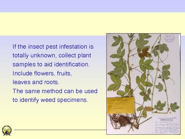 If the insect pest infestation is totally unknown, collect plant samples to aid identification. Include flowers, fruits, leaves and roots. The same method can be used to identify weed specimens.