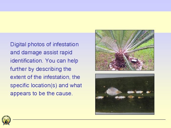 Digital photos of infestation and damage assist rapid identification. You can help further by describing the extent of the infestation, the specific location(s) and what appears to be the cause.