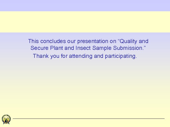 This concludes our presentation on “Quality and Secure Plant and Insect Sample Submission. ” Thank you for attending and participating.