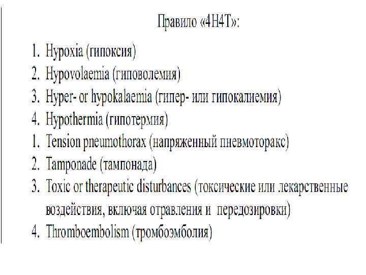 Необходимо помнить о решении таких проблем как: • • Гиповолемия Напряженный пневмоторакс Тампонада сердца Гипоксия Тромбоэмболия Гипо -или гиперкалиемия Гипотермия