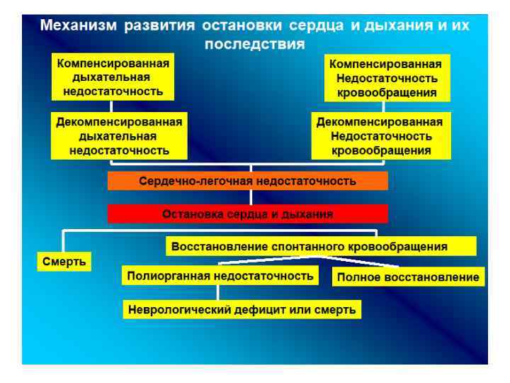 • Несмотря на множество причин остановки сердца, имеет место только один из двух путей патогенеза: это либо развитие декомпенсированной дыхательной недостаточности и остановкой сердца, либо расстройства циркуляции с дальнейшим развитием недостаточности кровообращения, которые, в свою очередь, также приводят к остановке сердца.