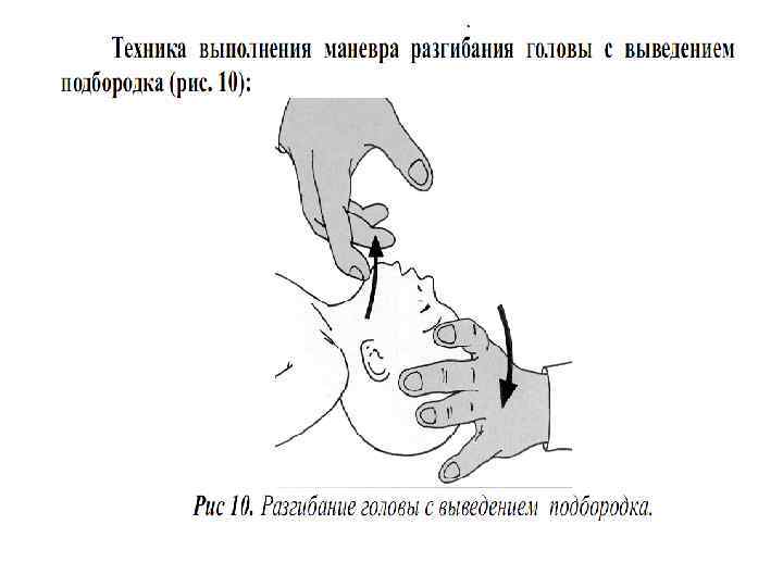 Этап А – реанимация: обеспечение проходимости дыхательных путей • Тройной приём Сафара (запрокидывание головы + выдвижение нижней челюсти + открывание рта). Левую руку расположите на лбу пострадавшего, правую руку расположите под задней поверхностью шеи и запрокиньте голову назад. Поместите указательный палец правой руки на подбородок пострадавшего под нижнюю челюсть и слегка потяните нижнюю челюсть вперёд и вверх. Дополнительно фиксируют подбородок большим пальцем правой руки под нижней губой.
