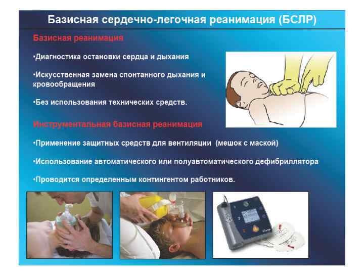 • Базисная СЛР – комплекс мероприятий, направленных на восстановление эффективной вентиляции путем вдувания воздуха в легкие и на восстановление кровообращения путем выполнения закрытого массажа. Методы базисной реанимации, не требуют никакой специальной аппаратуры и медикаментов и могут быть применены в любых условиях.