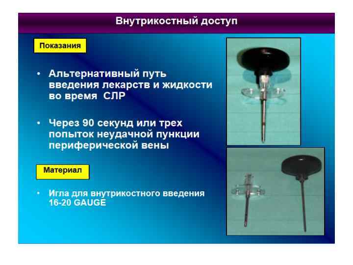 Пути введения лекарственных средств. • Внутривенный доступ (попытки катеризации центральной вены противопоказаны. Проводятся только после восстановления кровообращения • Внутрикостный доступ (большеберцовая кость или подвздошная кость). Все препараты и инфузионные среды. • Эндотрахеальное введение (адреналин, атропин, лидокаин, изопротеренол). • Внутрисердечные введения в настоящее время не используются!!!!!