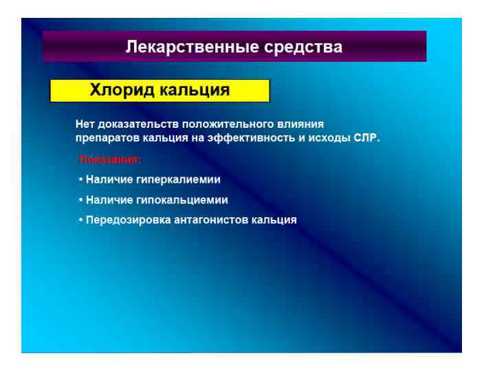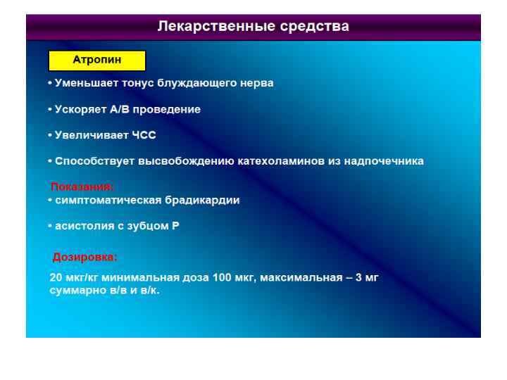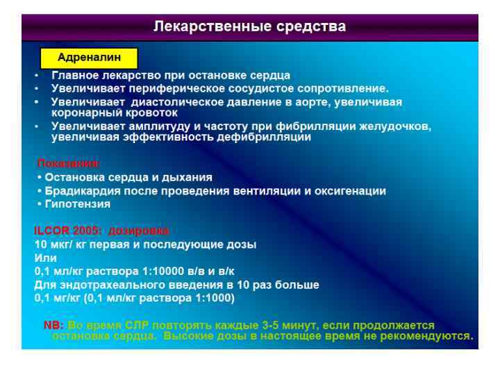 Медикаменты • Адреналин- 0. 1%-1 мл-1 мг в 0. 1 мл-0. 1 мг. • 10 мкгкг или 0. 01 мгкг или (1: 10 000)- 0. 1 -0. 3 млкгвв или вк. • Каждые 3 -5 мин реанимации. • Эндотрахеально 0. 1 мгкг или (1: 1 000)- 0. 1 млкг • Атропин-0. 1%-1 мл-1 мг вв. • 0. 02 мгкг , минимальная доза 0. 1 мг каждые 5 мин. • Бикарбонат натрия - 4 -5%-2 -4 млкг вв каждые 10 -15 мин реанимации.