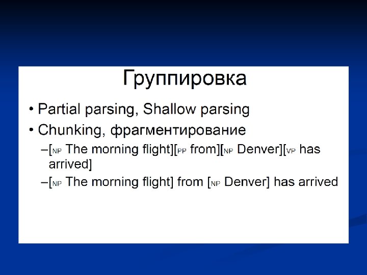 Используемые синтаксические представления: n n Грамматики зависимостей не дают возможности удобного представления словосочетаний как единиц анализа, а также соединения тех структур, которые по своей природе не являются зависящими друг от друга, например, сочинительных конструкций. Феном английской грамматики, демонстрирующим неудобство простого аппарата непосредственных составляющих, является возможность передвижения послеглагольных частиц: He called up his mother. He called her up twice a week.