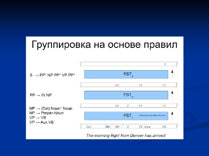 Грамматика конечных автоматов (Finite-State Transition Network) n Конечные автоматы являются декларативным средством представления, что означает возможность их обратимости, т. е. применения и для анализа, и для синтеза. Они также весьма эффективны с точки зрения скорости работы, но ограничены в возможности описания многих структур, встречающихся в ЕЯ, таких как вложенные конструкции, например, из вкладывающихся друг в друга придаточных предложений