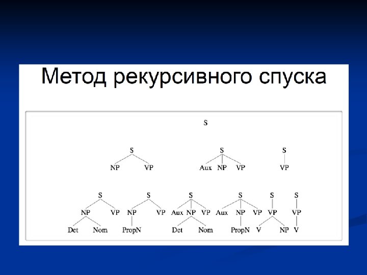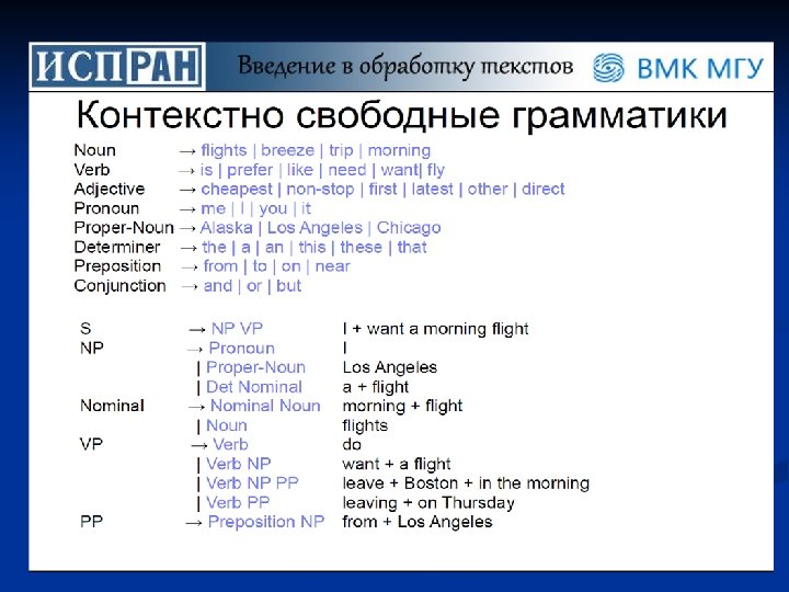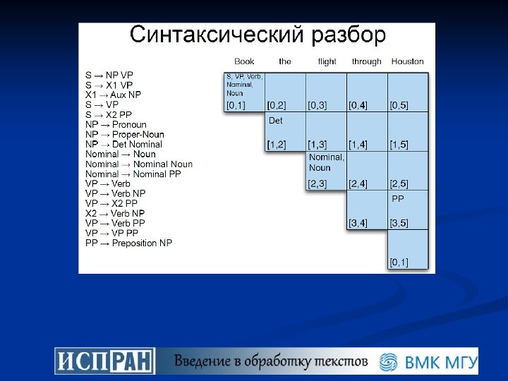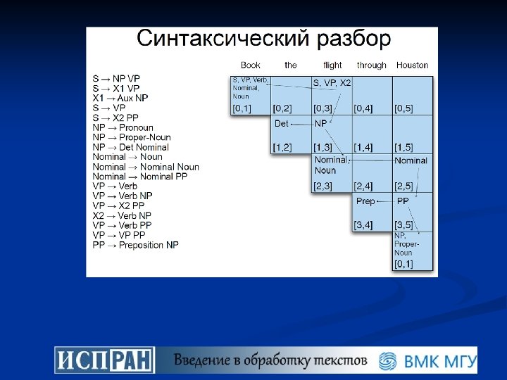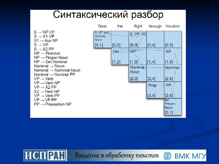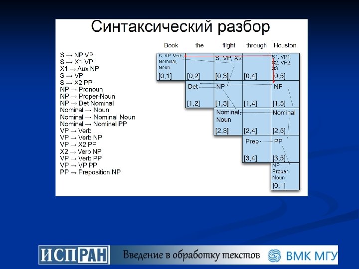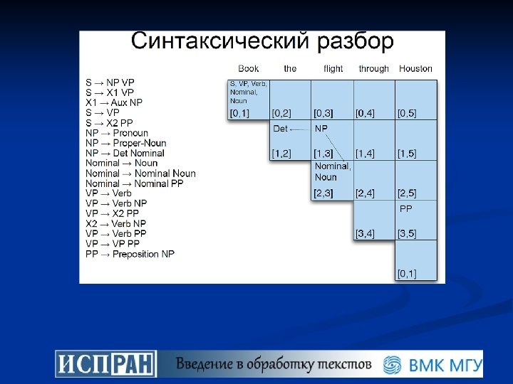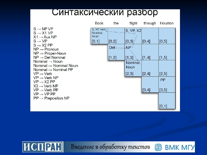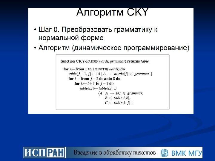 Алгоритмы реализации анализа в терминах КСГ (CFG) n Алгоритмы: n Метод рекурсивного спуска (top-down parsing) n Восходящий анализ (bottom-up parsing) n Алгоритм Кока-Янгера-Касами (CKY Parsing) n Алгоритм Эрли (Earley parser) n Chart parser § http: //en. wikipedia. org/wiki/ Category: Parsing_algorithms