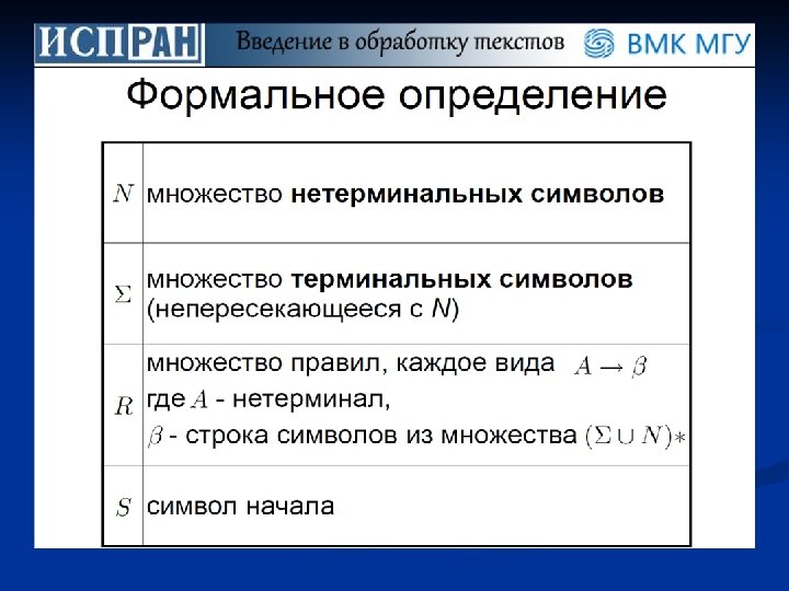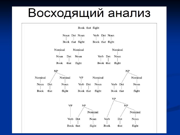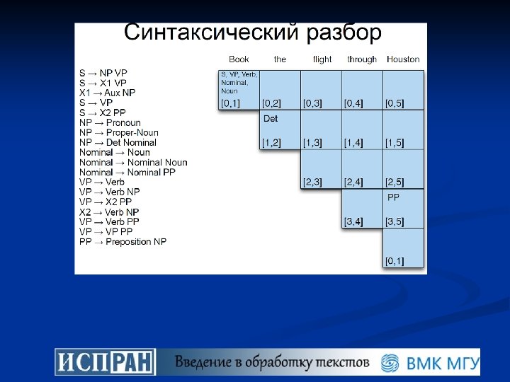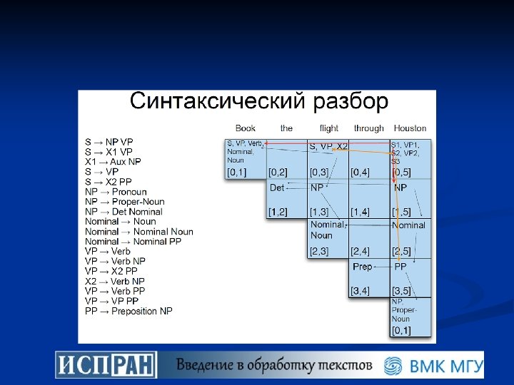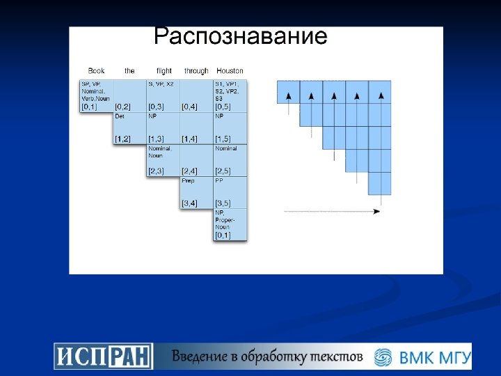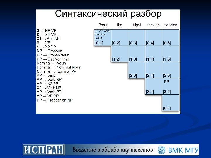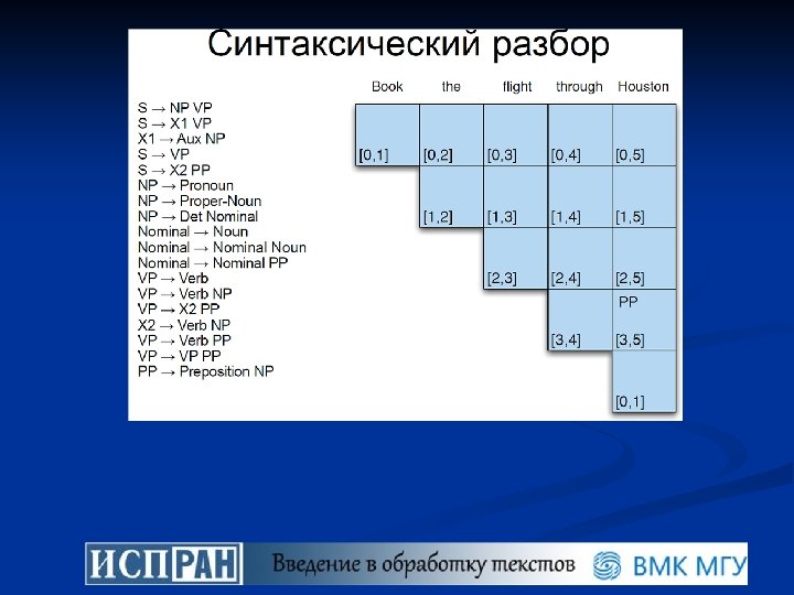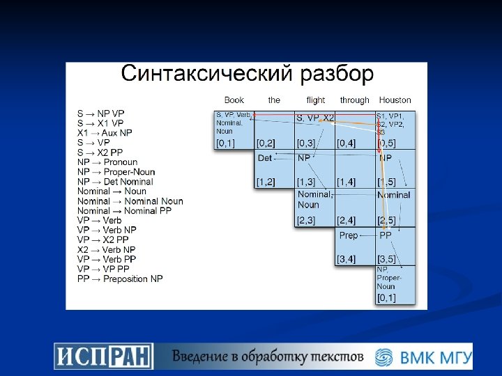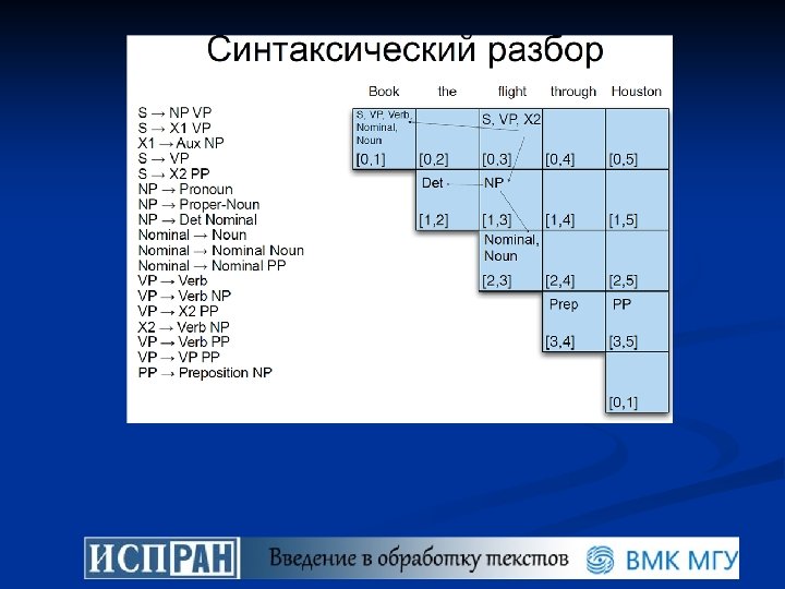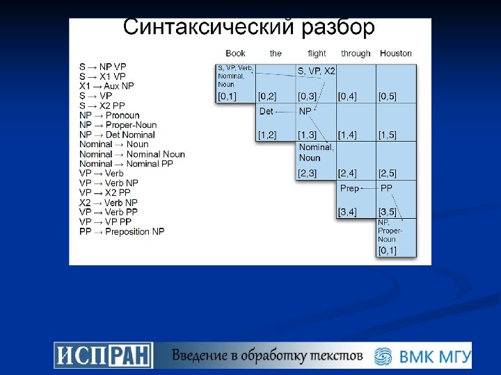 Алгоритмы реализации анализа в терминах КСГ (CFG) n Алгоритмы: n Метод рекурсивного спуска (top-down parsing) n Восходящий анализ (bottom-up parsing) n Алгоритм Кока-Янгера-Касами (CKY Parsing) n Алгоритм Эрли (Earley parser) n Chart parser § http: //en. wikipedia. org/wiki/ Category: Parsing_algorithms