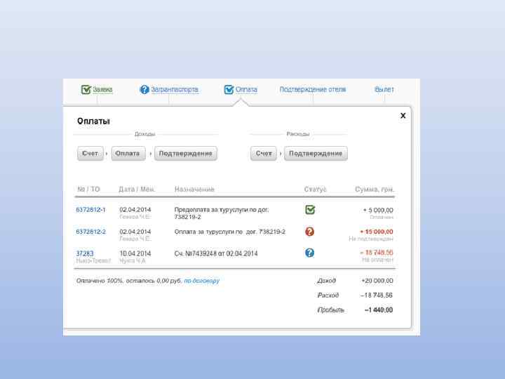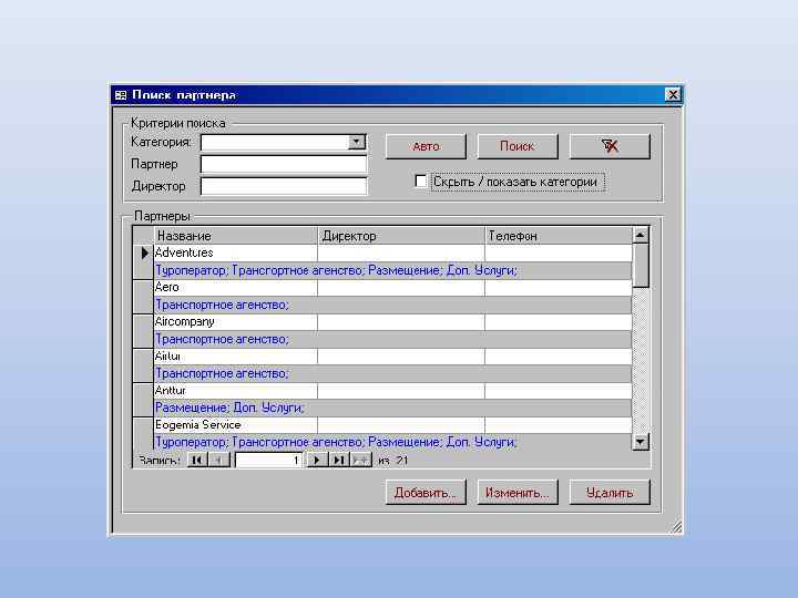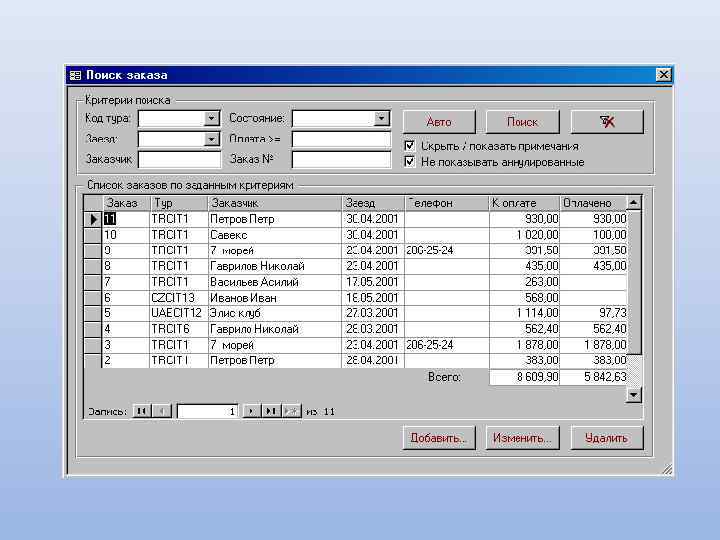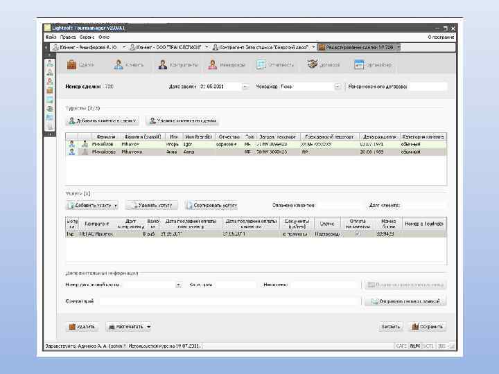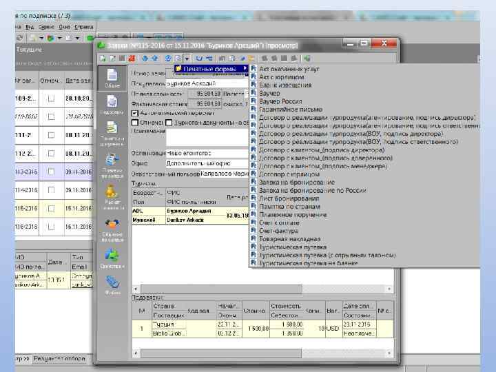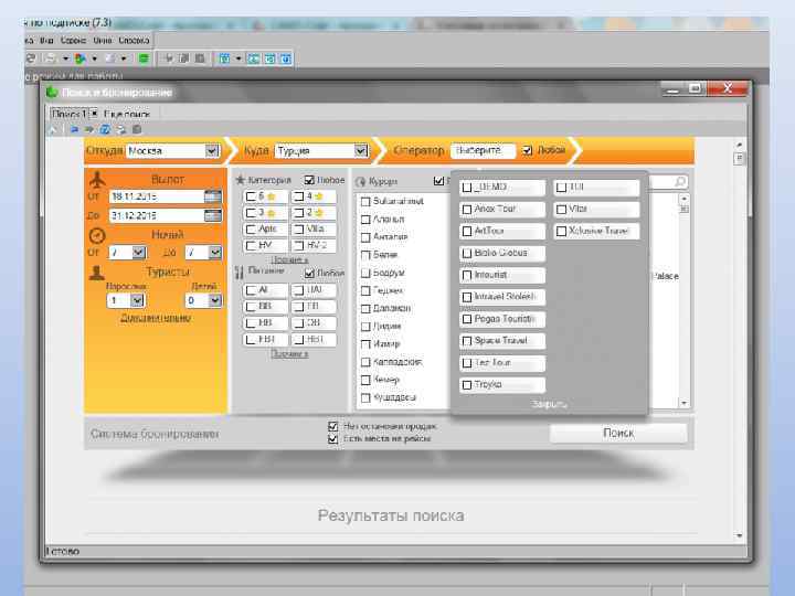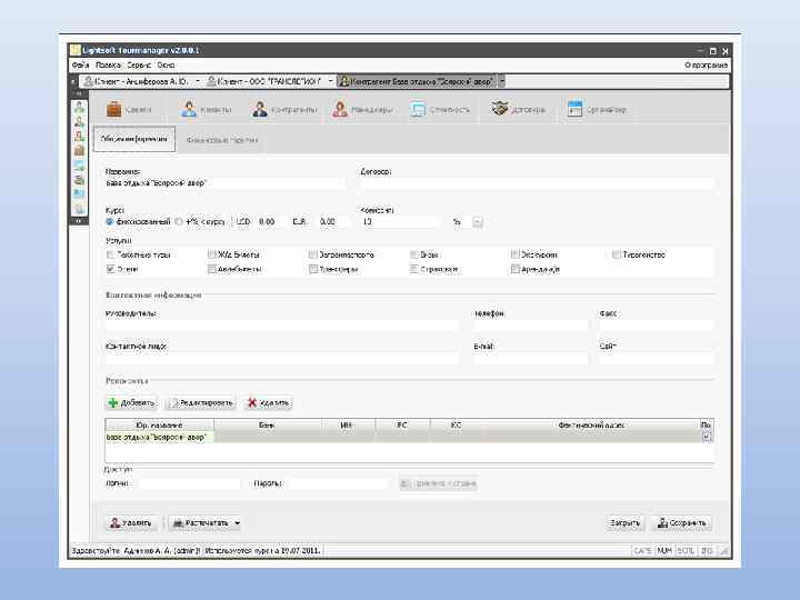 Основные возможности: Создание электронного документа «Заявка» с описанием состава тура Печать необходимых документов: договора, путевки ТУР-1, листа бронирования, счета, ваучера Ведение архива постоянных клиентов Учет платежей по заявкам: приход и расход Управление доступом пользователей программы Возможность ведения дополнительных справочников