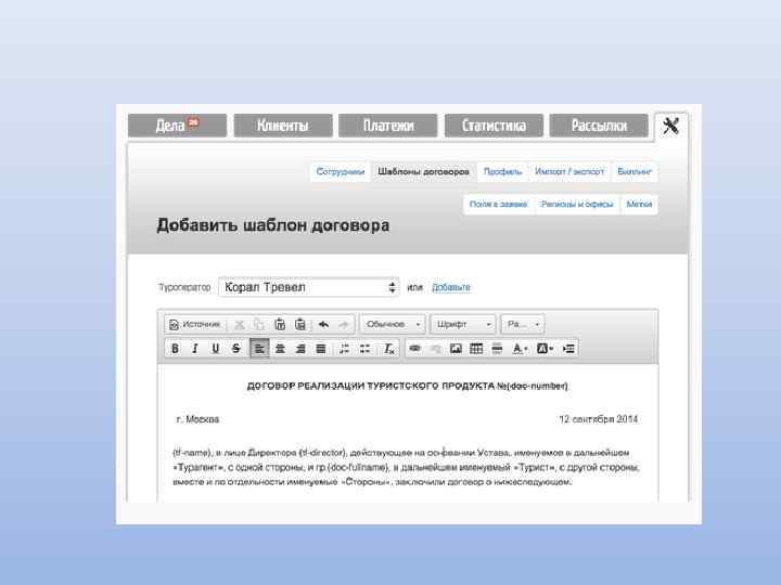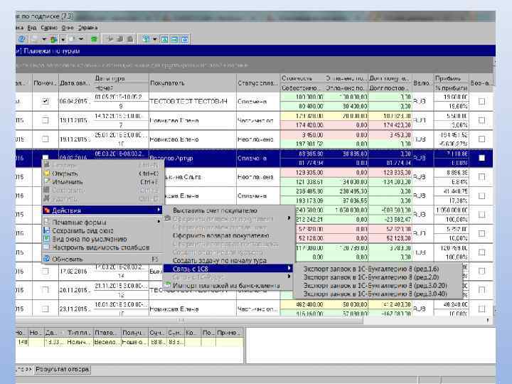 «Мастер-Тур» Формирование путевки Документооборот Проведение взаиморасчетов с клиентами Работа с платежами клиентов и поставщиков Взаимодействие с системами онлайн-бронирования Организация работы с базой данных клиентов Редактирование информации о клиентах Организация работы с базой данных партнеров Экспорт данных в 1 С: Предприятие Контроль работы менеджеров Статистическая обработка данных, формирование отчетов