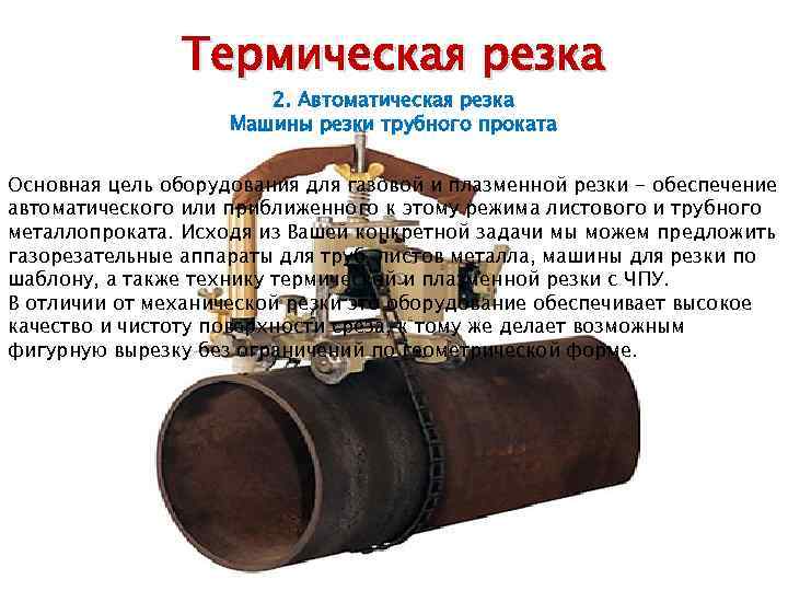 Термическая резка 2. Автоматическая резка Машины резки трубного проката Основная цель оборудования для газовой и плазменной резки - обеспечение автоматического или приближенного к этому режима листового и трубного металлопроката. Исходя из Вашей конкретной задачи мы можем предложить газорезательные аппараты для труб, листов металла, машины для резки по шаблону, а также технику термической и плазменной резки с ЧПУ. В отличии от механической резки это оборудование обеспечивает высокое качество и чистоту поверхности среза, к тому же делает возможным фигурную вырезку без ограничений по геометрической форме.
