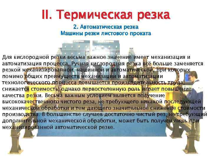 II. Термическая резка 2. Автоматическая резка Машины резки листового проката Для кислородной резки весьма важное значение имеет механизация и автоматизация процесса. Ручная кислородная резка всё больше заменяется резкой механизированной, машинной и автоматической, при которых помимо общих преимуществ механизации и автоматизации технологического процесса повышается производительность труда, снижается стоимость; однако первостепенную роль играет повышение качества резки. Весьма важным условием является получение высококачественного чистого реза, не требующего никакой последующей механической обработки и тем дающего значительное снижение стоимости производства. В большинстве случаев достаточно чистый рез, не требующий дополнительной механической обработки, может быть получен лишь при механизированной автоматической резке.