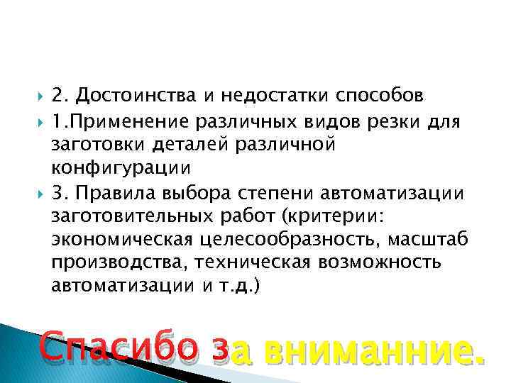 2. Достоинства и недостатки способов 1. Применение различных видов резки для заготовки деталей различной конфигурации 3. Правила выбора степени автоматизации заготовительных работ (критерии: экономическая целесообразность, масштаб производства, техническая возможность автоматизации и т. д. ) а Спасибо за вниманние.
