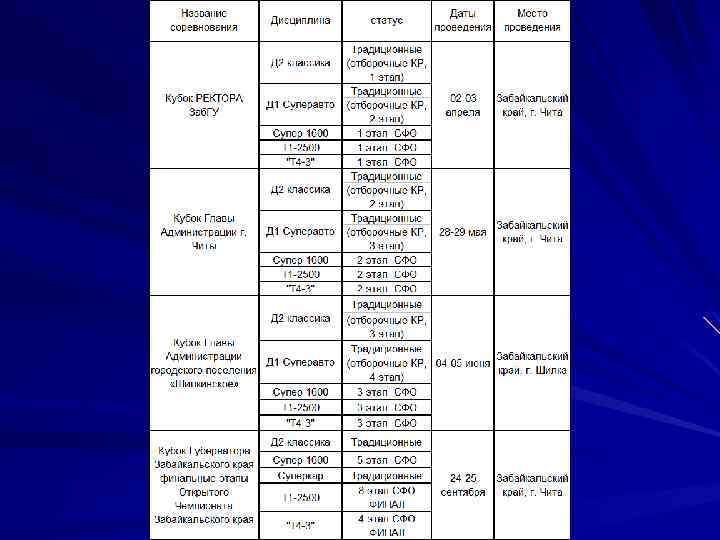 Ранги соревнований по автомобильному кроссу для Забайкальского края Д 2 –классика - Традиционные (отборочные этапы Кубка России) Супер 1600 - Чемпионат Сибирского федерального округа Суперкар - Традиционные (отборочные этапы Кубка России) Т 1 -2500 - Чемпионат Сибирского федерального округа Т 4 -3 - Чемпионат Сибирского федерального округа Во всех дисциплинах проводится Открытый Чемпионат Забайкальского края