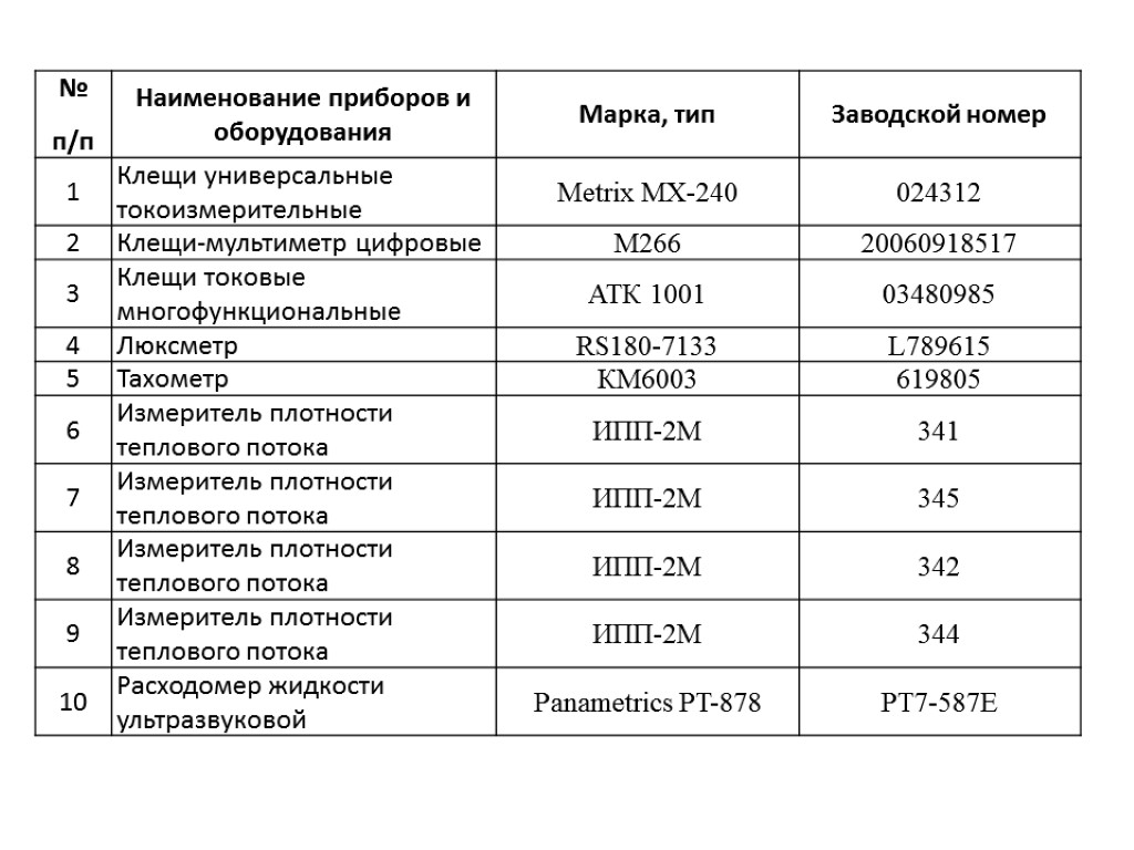 Сведения о наличии приборов и оборудования