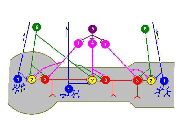 • 2. Длинный отросток идет к рабочему органу, короткие распределяются в самом ганглии и синаптически контактируют с вставочным или эффекторным нейронами.