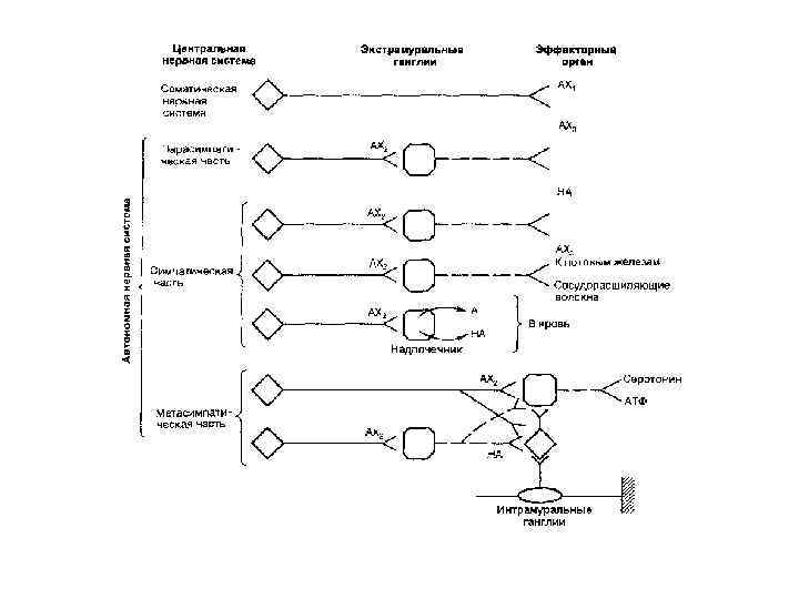 • Симпатическая и парасимпатическая части автономной нервной системы имеют центральные и периферические структуры, метасимпатический — только периферические