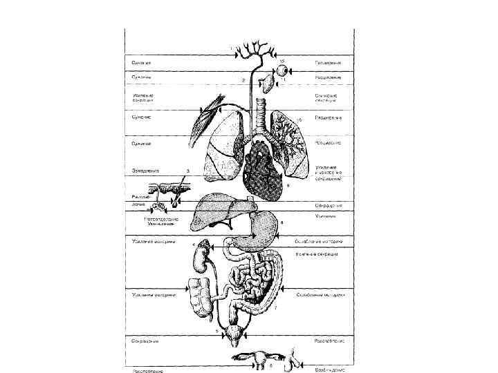 • В целом деятельность симпатической нервной системы направлена энергетическое обеспечение организма (эрготропная функция). • Ее влияния приводят к перераспределению кровотока, усилению обменных процессов, выделению сахара из печени в кровь и т. п. • Это необходимо для поддержания нормальных жизненных условий в ситуациях, требующих значительных энерготрат в связи с мышечной деятельностью, при снижении температуры окружающей среды, при эмоциональных реакциях.