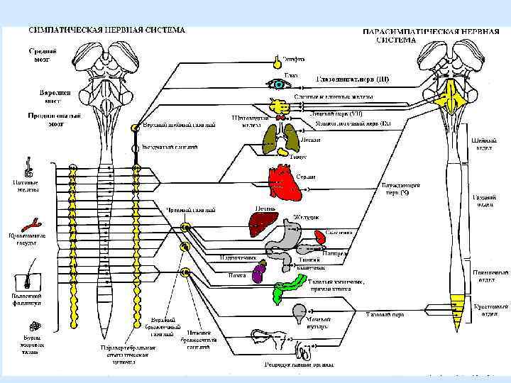 Парасимпатическая нервная система Центры - в ядрах черепно-мозговых нервов: • Ш пара – глазодвигательный нерв • УП пара – лицевой нерв (барабанная струна) • 1 Х пара – языкоглоточный нерв • Х пара – блуждающий нерв • а также во 2 -4 сегментах крестцового отдела спинного мозга