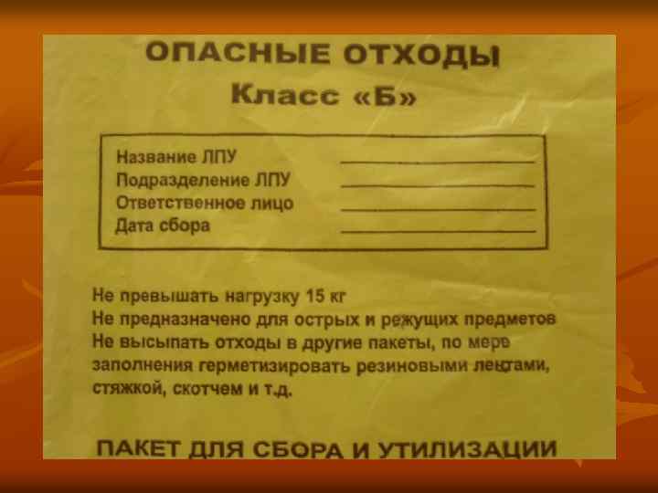 Жидкие биологические отходы, использованные одноразовые колющие (режущие) инструменты и другие изделия медицинского назначения помещают в твердую (непрокалываемую) влагостойкую герметичную упаковку (контейнеры). Мягкая упаковка (одноразовые пакеты) для сбора отходов класса В должна быть закреплена на специальных стойках (тележках) или контейнерах. После заполнения пакета не более чем на 3/4, сотрудник, ответственный за сбор отходов в данном медицинском подразделении, с соблюдением требований биологической безопасности завязывает пакет или закрывает с использованием бирок-стяжек или других приспособлений, исключающих высыпание отходов класса В.