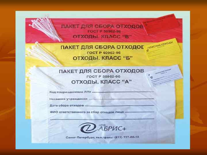 Правила пользования полиэтиленовым пакетом для сбора и хранения отходов класса «Б» 1. Достаньте пакет нужного цвета 2. Расправьте и раскройте его по горловине 3. Вставте пакет до касания дна в подходящую по размеру тару для удобства применения. 4. Загните края пакета по краю тары для фиксации пакета. __________________________ 5. Заполните примерно, на ¾ объема неострыми отходами выбранного класса опасности. 6. Заполните бирку, отвечая на вопросы указанные на ней.