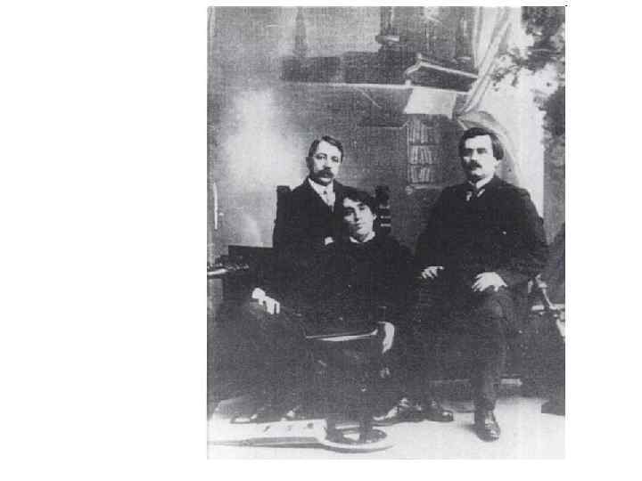 М. В. Матюшин, К. С. Малевич и А. Е. Крученых на даче Матюшина в Уусикиркко в Финляндии. 1913 В руках Крученых - вариант разработанной Малевичем обложки к