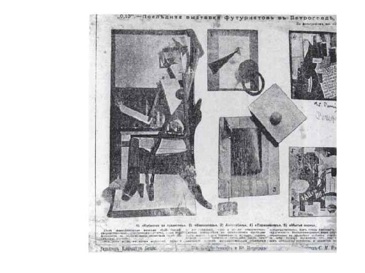“Беспредметничество”, которое лежало в основе всех этих групп, начиная от гражданина Малевича, Татлина, Мансурова, Филонова, Матюшина, и кончая “обэреутами”, представляло собой способ шифрованной передачи за границу сведений о Советском Союзе путем печатной репродукции картин “беспредметников” в советских журналах, путем переписки с художниками, проживающими за границей (художник Лисицкий, проживающий в Германии, Малевич говорил мне о других учениках в Польше, но я не помню их фамилии). (Из архива ГПУ)