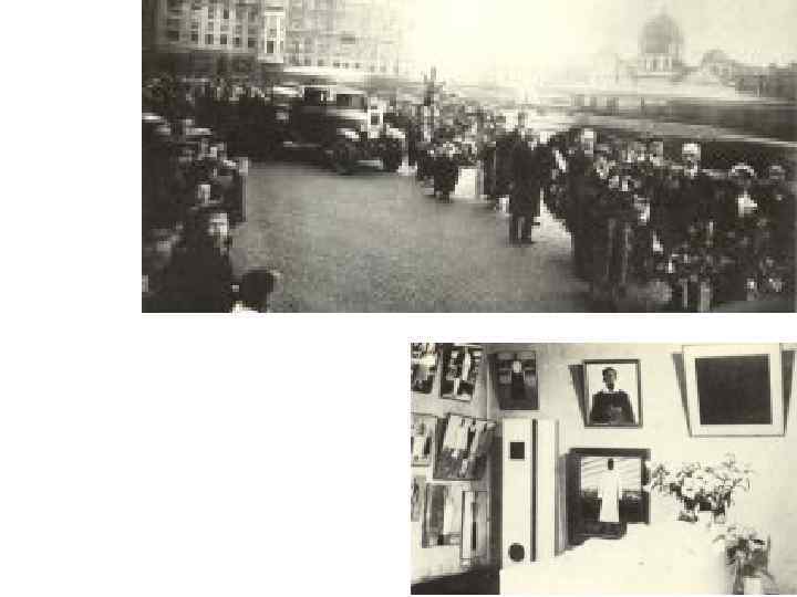 Малевич на смертном одре. 1935 Слева, в глубине - супрематический гроб с черными кругом и квадратом, расписанный Николаем Суетиным