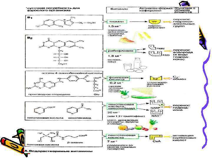 Водорастворимые витамины Витамин В 1 тиамин антиневритический витамин, аневрин, бери-бери витамин, анти-бери витамин В 2 рибофлавин стимулятор роста, витамин G, лактофлавин Витамин РР кислота никотиновая, никотинамид ниацин, антипеллагрический витамин, витамин В 3, ниацин амид, амид никотиновой кислоты Витамин В 5 кислота пантотеновая антидерматитный, фактор против дерматита цыплят, фильтратный фактор, пантотен, витамин BX Витамин В 6 пиридоксин адермин, фактор Y Витамин В 12 цианкобаламин антианемический витамин ВС кислота фолиевая фолацин, птероилглутаминовая кислота, антианемический витамин; фактор роста цыплят; индекс "С" произведен от англ. chicken - цыпленок Витамин С кислота аскорбиновая противоцинготный витамин, противоскорбутный витамин Витамин Р биофлавоноиды, витамин проницаемости, капилляроукрепляющий витамин