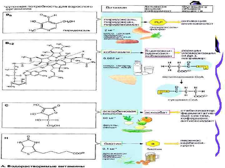 Определение, общие сведения об источниках, потребности и биологической активности витаминов • Витамины – это органические химические соединения, которые являются необходимыми факторами для роста и развития, но не синтезируются в тканях человека. • По этой причине витамины обычно поступают с растительной пищей или с продуктами животного происхождения. • Большинство витаминов являются предшественниками коферментов, а некоторые соединения выполняют сигнальные функции. • Суточная потребность в витаминах зависит от возраста, пола и физиологического состояния организма (период беременности и кормления ребенка, физические нагрузки).