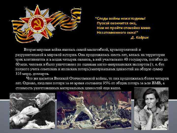 "Следы войны неизгладимы! Пускай окончится она, Нам не пройти спокойно мимо Незатемненного окна!" Д. Кедрин Вторая мировая война явилась самой масштабной, кровопролитной и разрушительной в мировой истории. Она продолжалась шесть лет, велась на территории трех континентов и в водах четырех океанов, в ней участвовало 40 государств, погибло до 60 млн. человек и было уничтожено по оценкам англо-американских экспертов (т. е. без полного учета советских и японских потерь) материальных ценностей на общую сумму 316 млрд. долларов. Что же касается Великой Отечественной войны, то она продолжалась более четырех лет. Однако, людские потери за ее время составили 95% от общих потерь за всю ВМВ, а стоимость уничтоженных материальных ценностей еще выше.