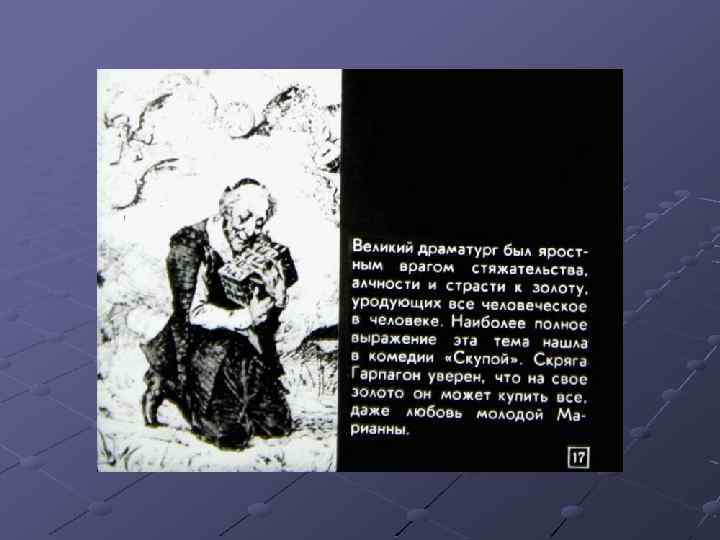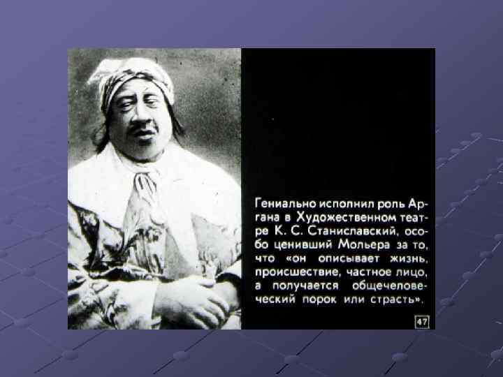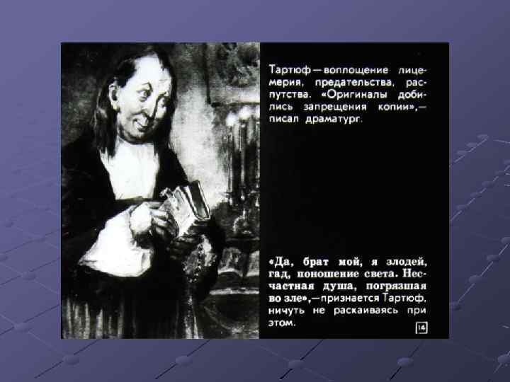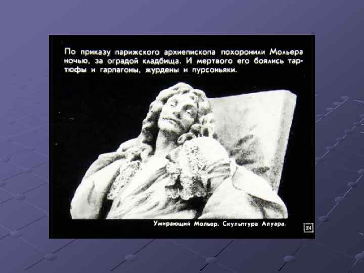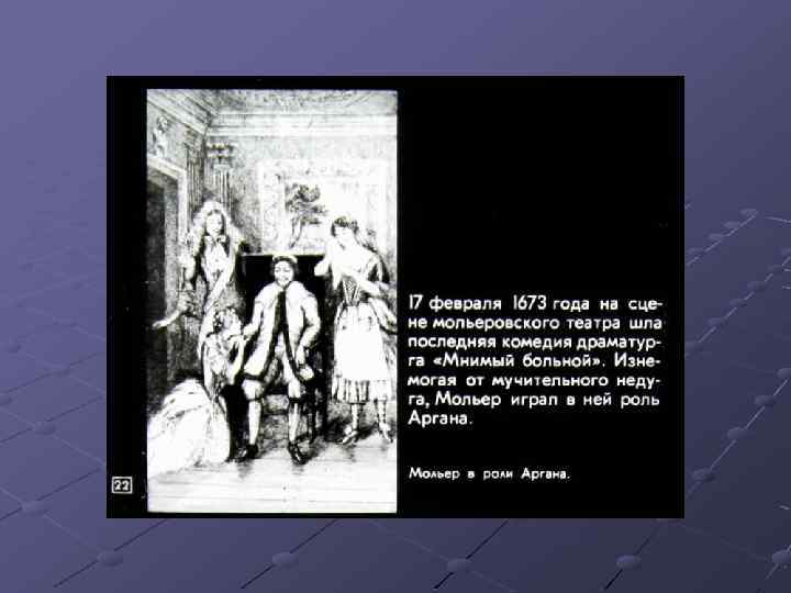 1. Бояджиев Г. П. Мольер: исторические пути формирования жанра высокой комедии. 2. Бояджиев Г. П. От Софокла до Брехта за 40 театральных вечеров. – М. , 1981. – с. 164 -179. 3. Гликман И. Д. Мольер: критико-биографический очерк, – М. – Л. – 1966. 4. Диафильм. Автор кандидат пед. Наук П. Прессман, художникоформитель Ж. Гиричева, редактор В. Чернина. Д-262 -80 Студия «Диафильм» Госкино СССР. 1980 г. 101000. Москва. Центр. Старосадский пер. , 7 Черно-белый 0 -20