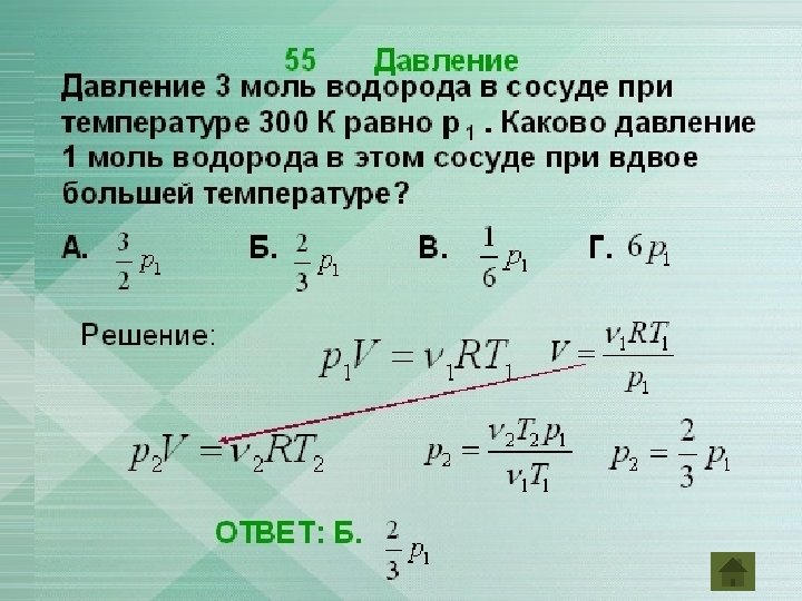55 Давление 3 моль водорода в сосуде при температуре 300 К равно р 1. Каково давление 1 моль водорода в этом сосуде при вдвое большей температуре? А. Б. Ответ: В. Г.