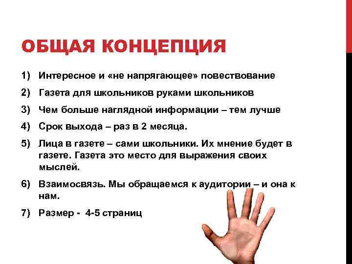 ОБЩАЯ КОНЦЕПЦИЯ 1) Интересное и «не напрягающее» повествование 2) Газета для школьников руками школьников 3) Чем больше наглядной информации – тем лучше 4) Срок выхода – раз в 2 месяца. 5) Лица в газете – сами школьники. Их мнение будет в газете. Газета это место для выражения своих мыслей. 6) Взаимосвязь. Мы обращаемся к аудитории – и она к нам. 7) Размер - 4 -5 страниц