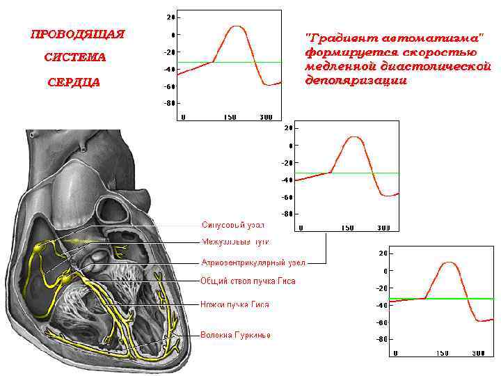 Клетки проводящей системы сердца и клетки синусового узла обладают способностью к спонтанному медленному увеличению ТМПД - уменьшению отрицательного заряда внутренней мембраны во время фазы 4. Этот процесс называется медленной спонтанной диастолической деполяризацией и лежит в основе автоматической активности клеток синусового узла и проводящей системы сердца. Медленная спонтанная диастолическая деполяризация водителей ритма.
