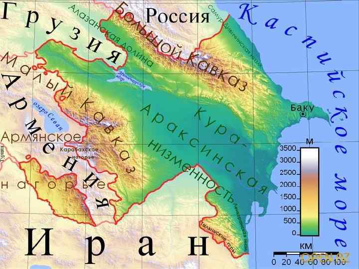 Географическое положение Азербайджан лежит на границе Европы и Азии. Около половины территории Азербайджана занято горами. На севере — хребет Кавказа, в средней части — Кура- Аракская низменность, на юго-востоке — Талышские горы и Ленкоранская низменность. Азербайджан по площади — самая крупная из республик Закавказья (заявленная площадь — около 86, 6 тыс. кв. км. Территория АР с севера на юг на 400 км, а с запада на восток — на 500 км. Крайние точки: северная — гора Гутон (3648 м) южная — река Астара , восточная — Нефтяные Камни , западная — озеро Джандаргель. Климатические зоны Азербайджана разнообразны — от тёплых и влажных субтропиков Ленкоранской низменности и Талыша до снежных высокогорий Кавказа. Главная река — Кура. Оросительные каналы: Верхнекарабахский, Верхнеширванский и другие, важным является Мингечаурское водохранилище. Почвы преимущественно серозёмные, в горах бурые и коричневые горно-лесные и горно-луговые; на Ленкоранской низменности — желтозёмы. В горах широколиственные леса. Среди природных богатств особое место принадлежит прекрасным климатическим и водолечебным курортам Азербайджана.