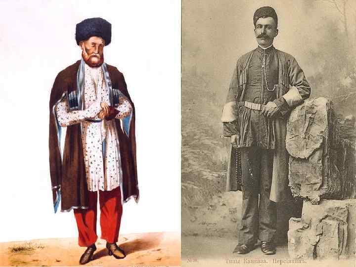 Мужской азербайджанский костюм включал в себя туникообразную нательную рубаху и нательные штаны, поверх которых надевались плотно облегавший фигуру распашной кафтан из покупной ткани на подкладке - "архалыг" и шерстяные или полушелковые шаровары. Архалыг стягивали нарядным серебряным поясом или подвязывали кушаком. Поверх него носили суконную "чуху" - вариант северокавказской черкески, на груди она также имела "газыри" - кармашки для патронов. В холодное время в горах надевали шубы и бурки. На голове носили барашковую шапку - "папах", имевшую много вариантов, под ней вышитую тюбетейку.