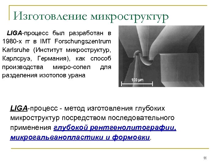Изготовление микроструктур LIGA-процесс был разработан в LIGA 1980 -х гг в IMT Forschungszentrum Karlsruhe (Институт микроструктур, Карлсруэ, Германия), как способ производства микро-сопел для разделения изотопов урана LIGA-процесс - метод изготовления глубоких микроструктур посредством последовательного применения глубокой рентгенолитографии, микрогальванопластики и формовки. 11