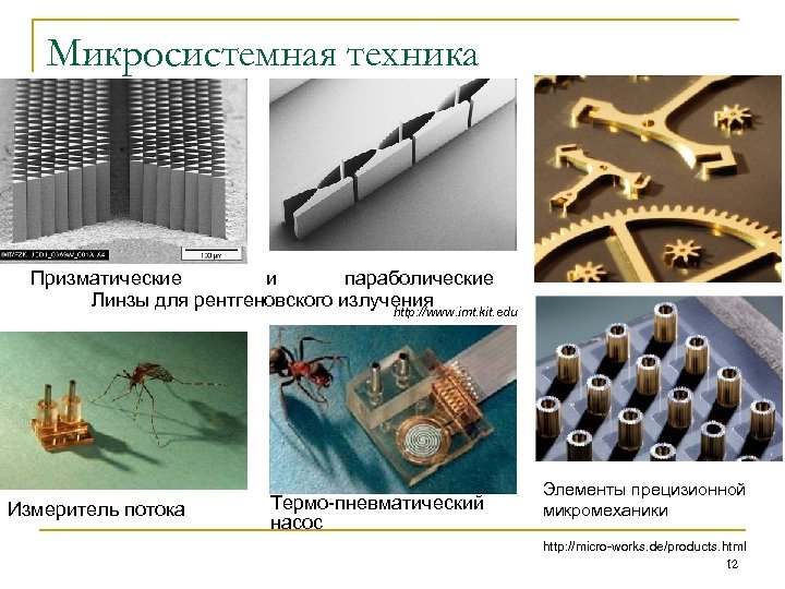 Микросистемная техника Призматические и параболические Линзы для рентгеновского излучения http: //www. imt. kit. edu Измеритель потока Термо-пневматический насос Элементы прецизионной микромеханики http: //micro-works. de/products. html 12