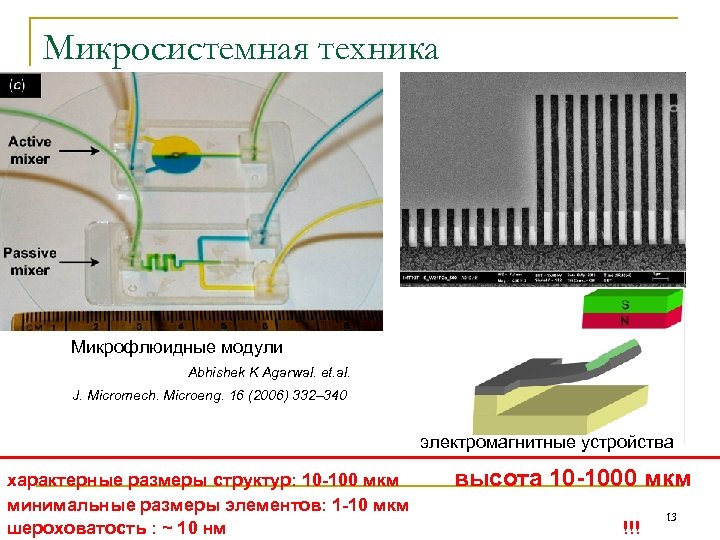 Микросистемная техника Микрофлюидные модули Abhishek K Agarwal. et. al. J. Micromech. Microeng. 16 (2006) 332– 340 электромагнитные устройства характерные размеры структур: 10 -100 мкм минимальные размеры элементов: 1 -10 мкм шероховатость : ~ 10 нм высота 10 -1000 мкм !!! 13