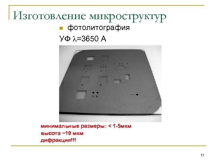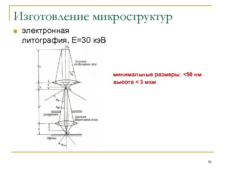 Изготовление микроструктур n электронная литография, Е=30 кэ. В минимальные размеры: <50 нм высота < 3 мкм 16