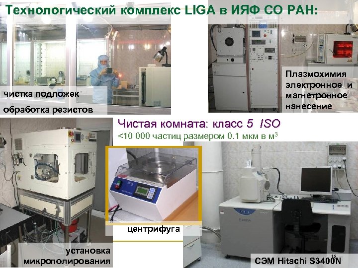 Технологический комплекс LIGA в ИЯФ СО РАН: Плазмохимия электронное и магнетронное нанесение чистка подложек обработка резистов Чистая комната: класс 5 ISO <10 000 частиц размером 0. 1 мкм в м 3 центрифуга установка микрополирования 18 СЭМ Hitachi S 3400 N