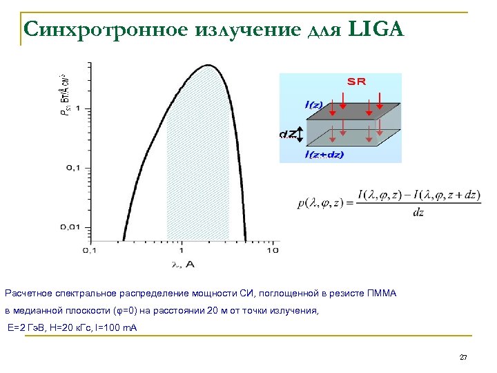 Синхротронное излучение для LIGA Расчетное спектральное распределение мощности СИ, поглощенной в резисте ПММА в медианной плоскости (φ=0) на расстоянии 20 м от точки излучения, Е=2 Гэ. В, Н=20 к. Гс, I=100 m. A 27