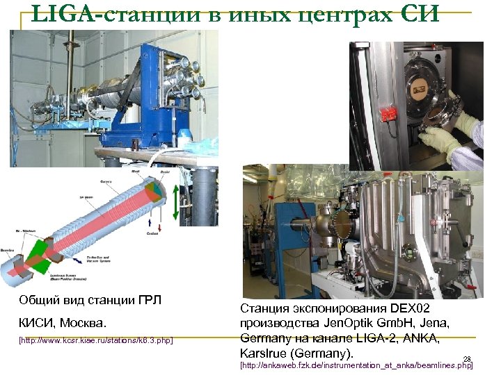 LIGA-станции в иных центрах СИ Общий вид станции ГРЛ КИСИ, Москва. [http: //www. kcsr. kiae. ru/stations/k 6. 3. php] Станция экспонирования DEX 02 производства Jen. Optik Gmb. H, Jena, Germany на канале LIGA-2, ANKA, Karslrue (Germany). 28 [http: //ankaweb. fzk. de/instrumentation_at_anka/beamlines. php]