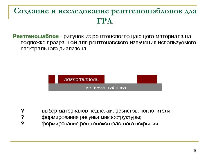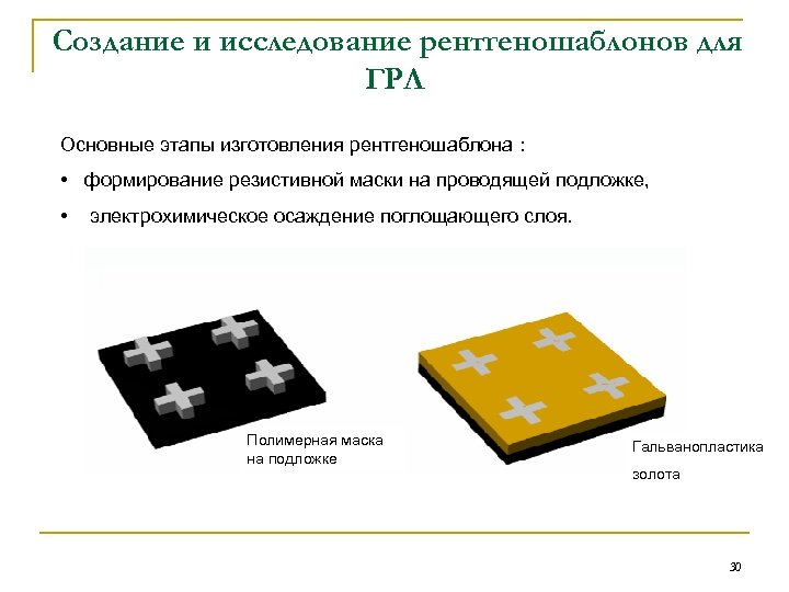 Создание и исследование рентгеношаблонов для ГРЛ Рентгеношаблон– рисунок из рентгенопоглощающего материала на Рентгеношаблон подложке прозрачной для рентгеновского излучения используемого спектрального диапазона. поглотитель подложка шаблона ? ? ? выбор материалов подложки, резистов, поглотителя; формирование рисунка микроструктуры; формирование рентгеноконтрастного покрытия. 29