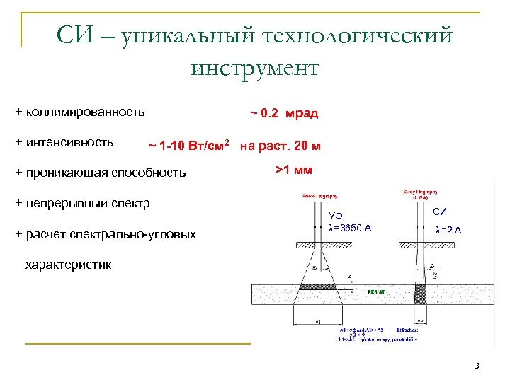 СИ – уникальный технологический инструмент + коллимированность + интенсивность ~ 0. 2 мрад ~ 1 -10 Вт/см 2 на раст. 20 м + проникающая способность >1 мм + непрерывный спектр + расчет спектрально-угловых УФ =3650 А СИ =2 А характеристик 3