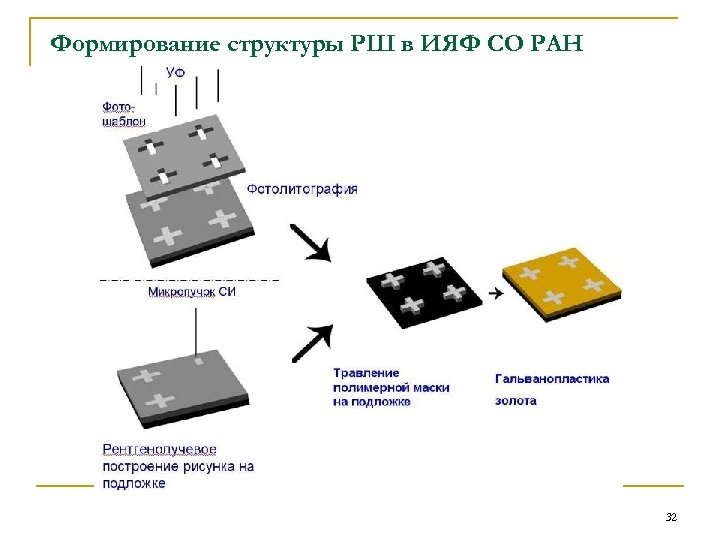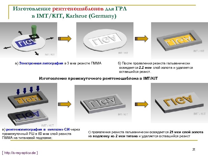 Изготовление рентгеношаблонов для ГРЛ в IMT/KIT, Karlsrue (Germany) а) Электронная литография в 3 мкм резисте ПММА б) После проявления резиста гальванически осаждается 2. 2 мкм слой золота и удаляется оставшийся резист. Изготовление промежуточного рентгеношаблона в IMT/KIT в) рентгенолитография в «мягком» СИ через промежуточный РШ в 60 мкм слой резиста ПММА на титановой подложке; [ http: //x-ray-optics. de ] г) проявления резиста гальванически осаждается 25 мкм слой золота на подложку из 2 мкм титана и удаляется оставшийся резист 31