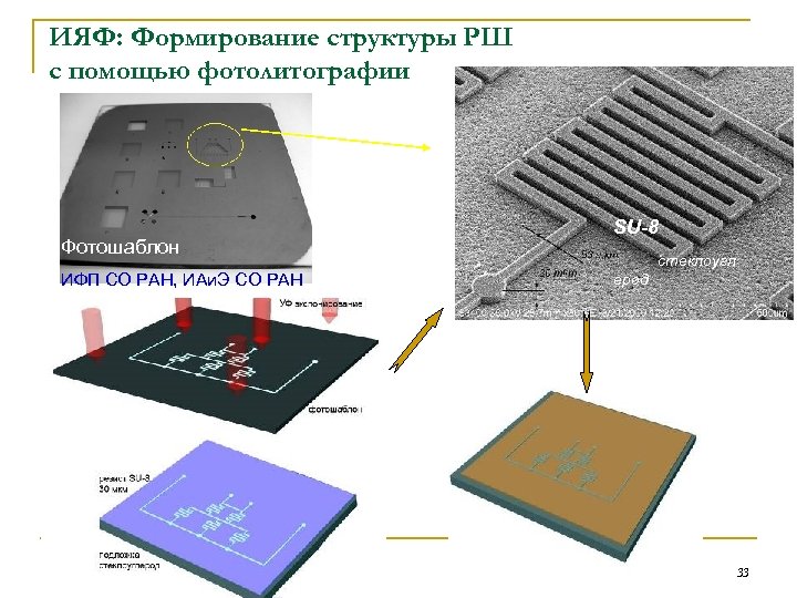 ИЯФ: Формирование структуры РШ с помощью фотолитографии Фотошаблон ИФП СО РАН, ИАи. Э СО РАН SU-8 стеклоугл ерод 33
