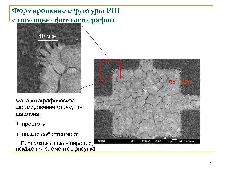 Формирование структуры РШ с помощью фотолитографии 10 мкм Re SU-8 Фотолитографическое формирование струкутры шаблона: + простота + низкая себестоимость - Дифракционные уширения, искажения элементов рисунка 34
